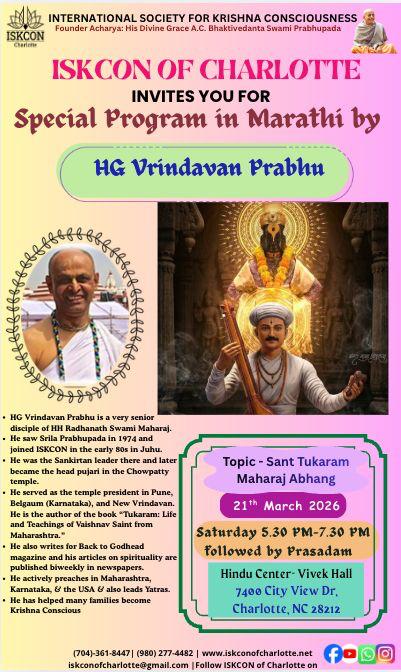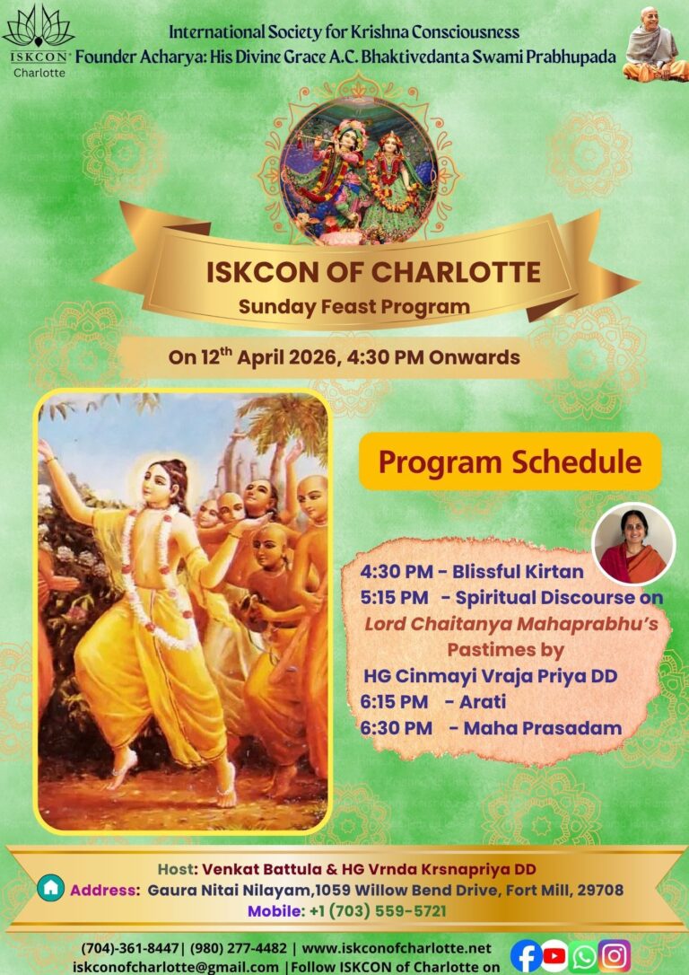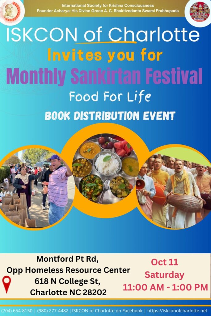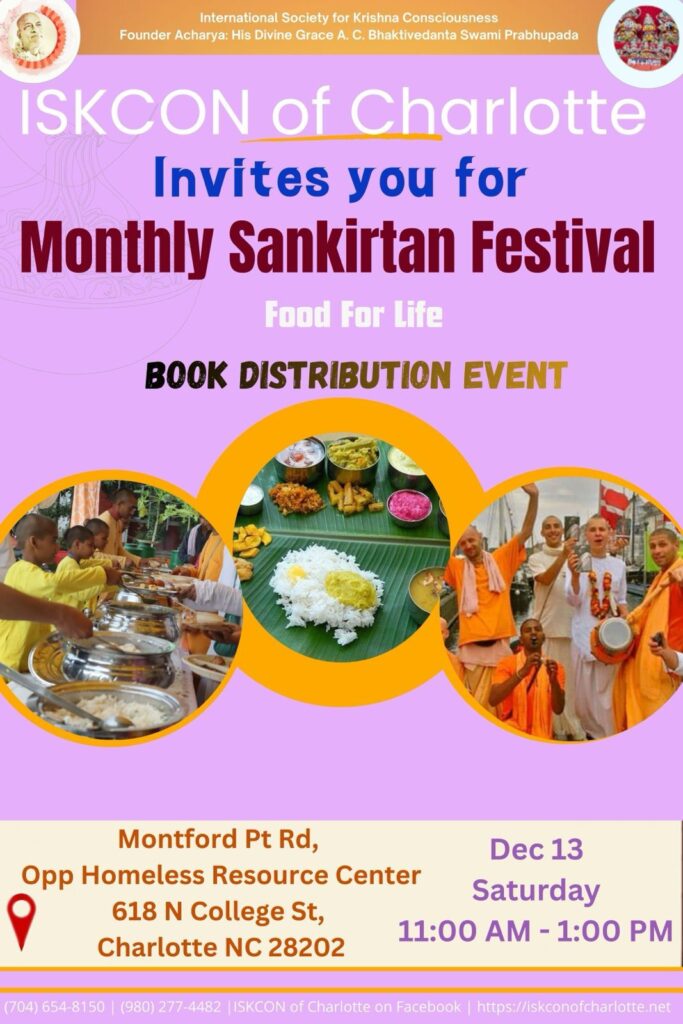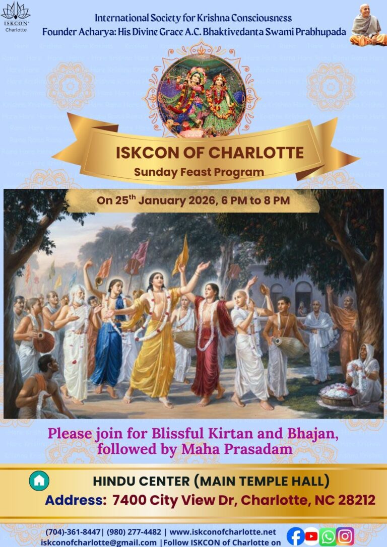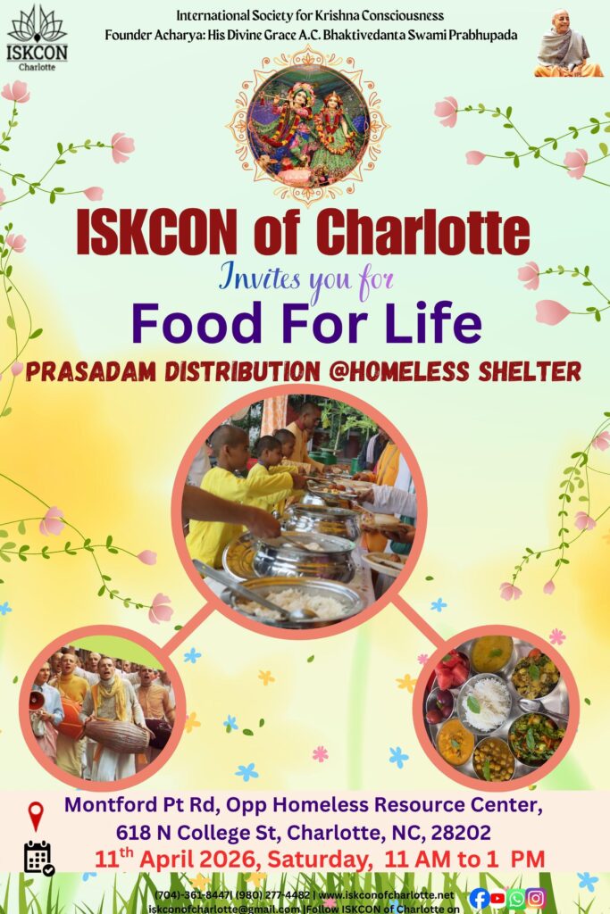 ISKCON of Charlotte center is open for congregations and groups of devotees in neighboring towns and cities. We serve the community through outreach, food distribution, bhakti education, festivals, music, meditation, chanting, and events.