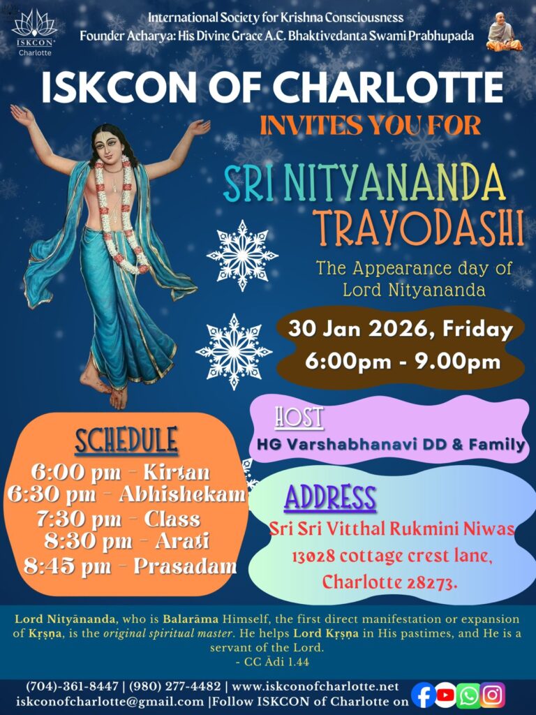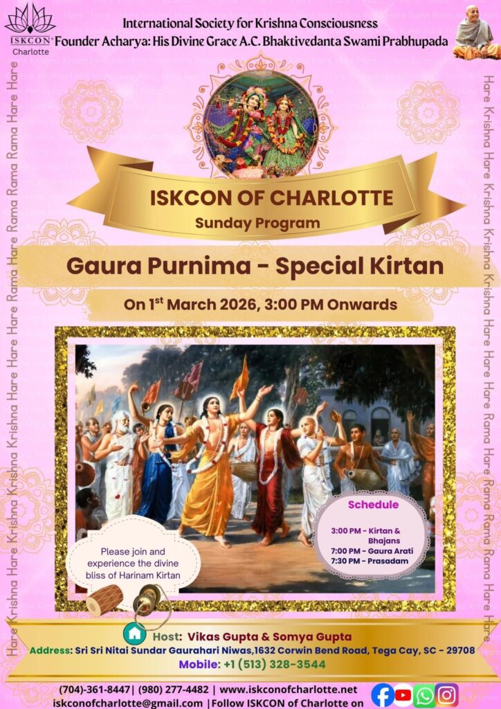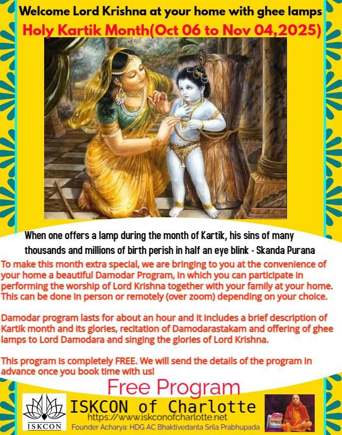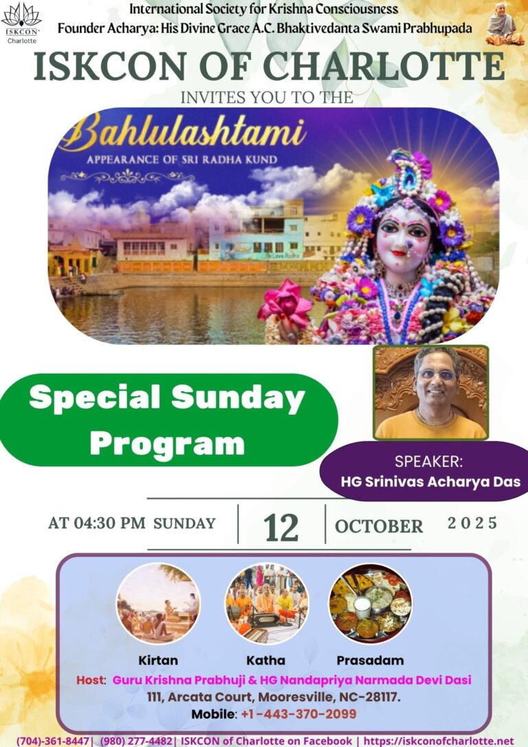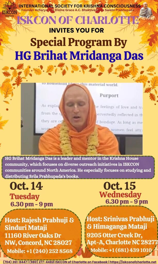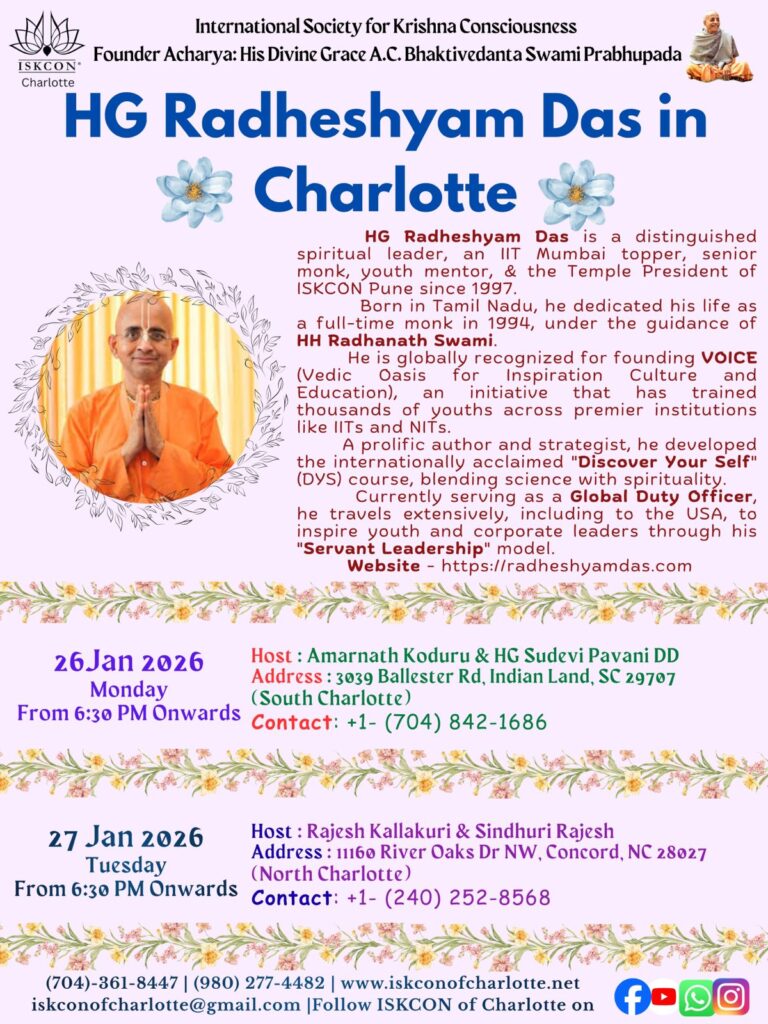 ISKCON of Charlotte center is open for congregations and groups of devotees in neighboring towns and cities. We serve the community through outreach, food distribution, bhakti education, festivals, music, meditation, chanting, and events.
