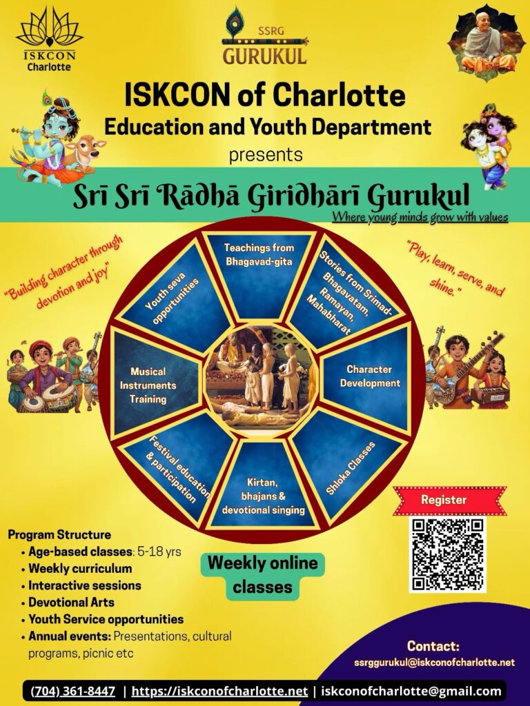 ISKCON of Charlotte is delighted to introduce Sri Radha Giridhari Gurukul — a nurturing spiritual school where young hearts and minds blossom with timeless values and divine wisdom.